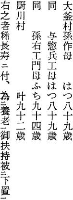 第一に高齢の者を撫養するため、八十八歳以上の者が居たならば年号と何年生れか、本年で何十何歳になるか、戸主との続柄、名前などをくわしく調べ、六月十五日までに町役人を経て届け出ること。