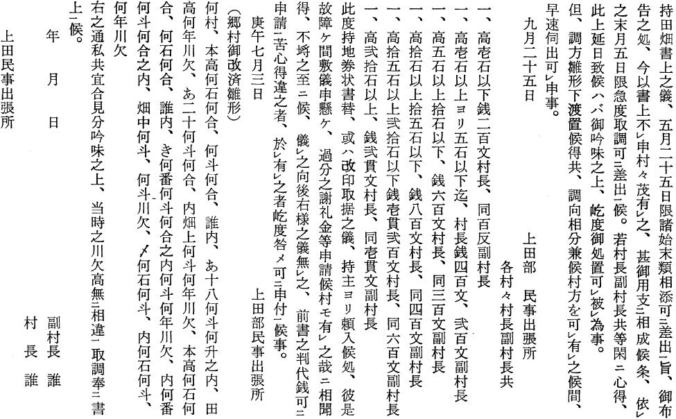 一、村内の者離散せざる様相心掛け貧窮のものあらば難渋いまだ行詰ざる内扶助の手立をなすべし自然下において心に任かせざる程の事は速に申し出すべく常に花美の奢を警め無益の費を省き農業を勧め請人成立の心遣い肝要となすべき事