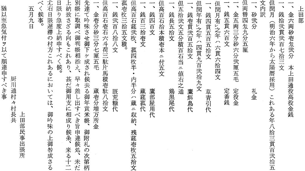 第七貢の納入は、期限が遅れれば咎められるし、村の損となるから、油断なく上納すること。