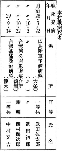 明治二十七年八月一日清国と国交を絶ち戦争になり、翌年四月十七日講話成立して日清戦争が終っている。この時の戦病死者は一千十九人中第二師団は七百三名で、岩手郡は八十名、本村は後述のように四名になっている。