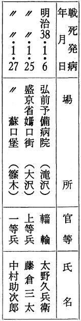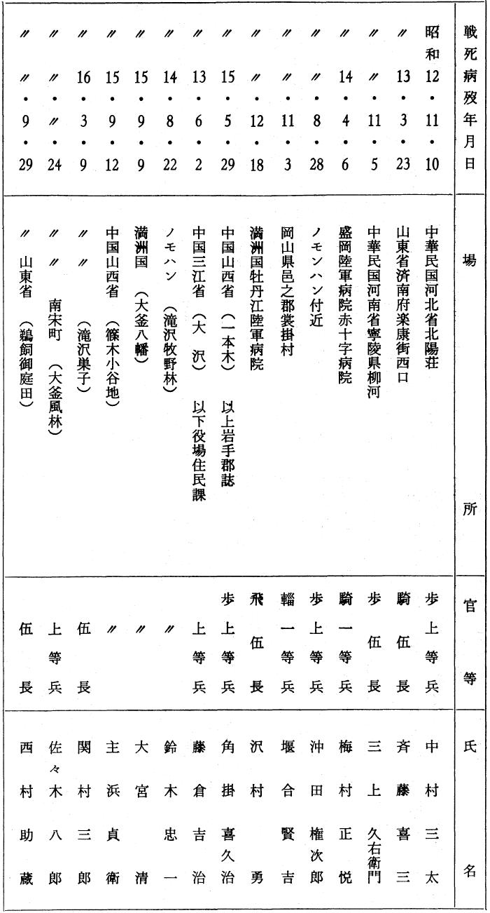 岩手県人で戦死したもの戦病死したもの一千二百六十三名に及んだという。その多くは、国家の手で靖国神社に合祀され、県でも県社招魂社に合祀して、国家に殉じたものゝ英霊を弔い慰霊の場とした。本村の戦病死者は下のごとく三名であった。