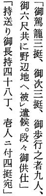 本道を通っての江戸往来なら、馬二匹、人足七人ですむのだが、峠越えの旅ではなんと三十八人かゝる。荷物は一人一個ずつ背負い、かごは棒、胴、戸とばらばらにしてかつぎ、槍もちの槍をもつ人夫まで必要なのだ。それに一行の手をひく手引き、腰をおす腰抱ぎが、一人ずつつく、また食物や山中で火をたくための薪や豆からを持つ者等で多くの人夫が必要なのだ。