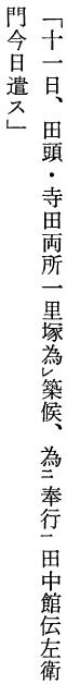 六月になって、田頭と寺田に一里塚を浄法寺と共に築いている。 (旧文書→) (藩日誌承慶二年六月)とある。田頭・寺田両所の一里塚築造は、このときの新築となる。田中館の故地は福岡であり、その地理に委しいものを起用し、道路改修に当らしめたものであろう。