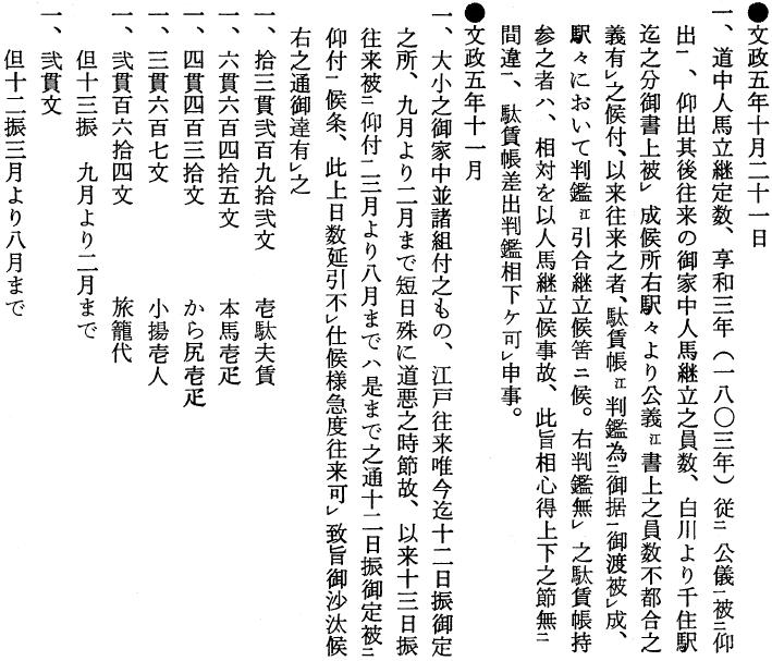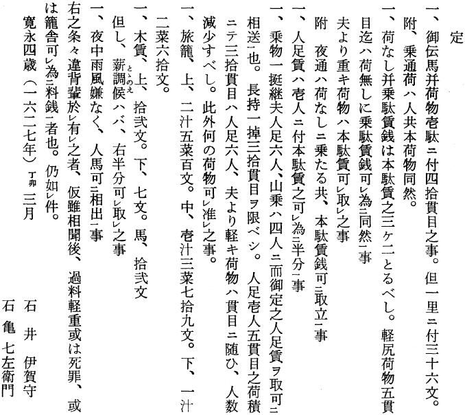 天和年中(1681―84年)、江戸上下の駄賃は、「上りは長(永)銭五貫四十文(金カ崎より江戸迄)、下りは長(永)銭四貫八百九拾弐文、但江戸附出し此外なり」「盛岡より江戸迄壱駄の賃、長(永)銭五貫首四十四文、但三十八貫匁壱駄壱貫匁百三十五文宛」(「南部叢書」所蔵「封内貢賦記」計算不合)とある。江戸盛岡間は百三十九里と査定されている。一貫目百三十五文は一里一文程度の駄賃となろう。一貫目一里一文とすると、この計算は盛岡の土蔵でなく、花巻の御蔵以南であろうか。伊達領金が崎駅より以南では五貫四十文とある。