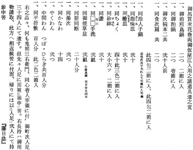 休憩時には、旅にもちなれている、もち米、男豆に、ごま、胡椒(こしょう)の粉、砂糖をまぶして作った菓子「香線」を食べ、従者や「鬼の如き」人夫達にもわけてやった昼ごろ、雪が降り出したが、風がないので豆殻をたいて冷えた焼飯を食べる。角館から持参した酒三升は、冷えたままだったが甘露の味だった。