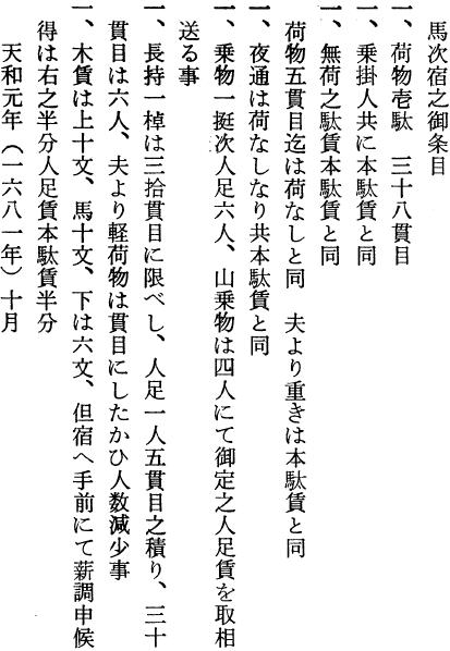 伝馬は『日本歴史辞典』によれば「近世宿場に常置され、公用の継立に当った馬である」という。江戸幕府による伝馬宿駅制度は、慶長以降(1596―1615年)整備されたが、南部領内では、利直の寛永四年(1627年)三月の定目が知られている。それによると、荷物一駄四十貫目としてあり、一里三十六文と規定してある。一町一文の計算であろう。人足賃は本駄賃の半分、宿泊は食事つき上中下があり、木賃には上下があった。馬宿は木賃の上と同額になっている。「夜中、雨風の嫌なく、人馬を相出す可き事」として、その違反者には、軽い過料・重い過料、死罪・籠舎を課するとしてある。