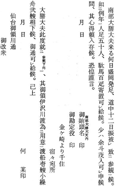 徳川将軍家は、諸国に巡見使派遣を公示したのは、寛永九年十二月一日とされている。南部領への指達もこのときであろう。御巡見使とは、将軍家から、諸国の行政・民情を査察して廻る特使で、将軍家と政府を代行するような威権のあるものである。このときは三代将軍家光の代で、徳川幕府の権力が充実統一されたころであり、六組の巡見使が全国に出されている。関東から出羽・奥州の巡見使としては、分部(わけべ)左京亮・大河内平十郎・松田善右衛門の三使が起用されている。この三使一行は、関東から奥州に入り、伊達領の南方から出羽を越し、漸次北進して津軽にいたり、同年八月南部領に入り、北の方から巡見して盛岡に入来、盛岡から雫石町を経て国見峠の国境線を検閲して帰り、その後郡山・大迫・遠野を巡視して花巻に出で、黒沢尻から伊達領に抜けている。