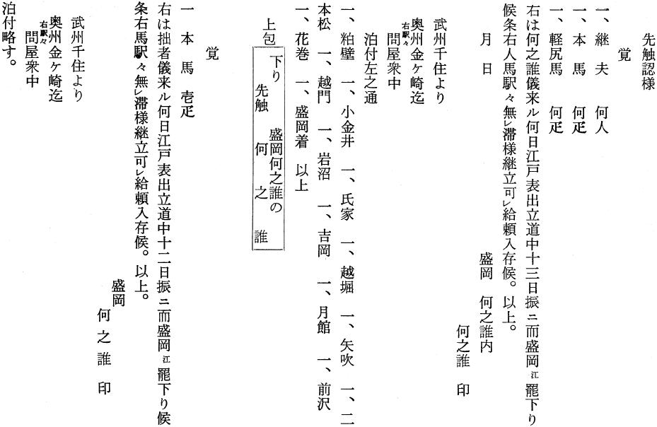盛岡城下と日本橋間は百三十九里、一日十二里では途中十一泊十二日目、一日十里の場合は途中十三泊十四日目で到着できた。徒歩飛脚は九日旅程であり、一日十五六里歩いている。