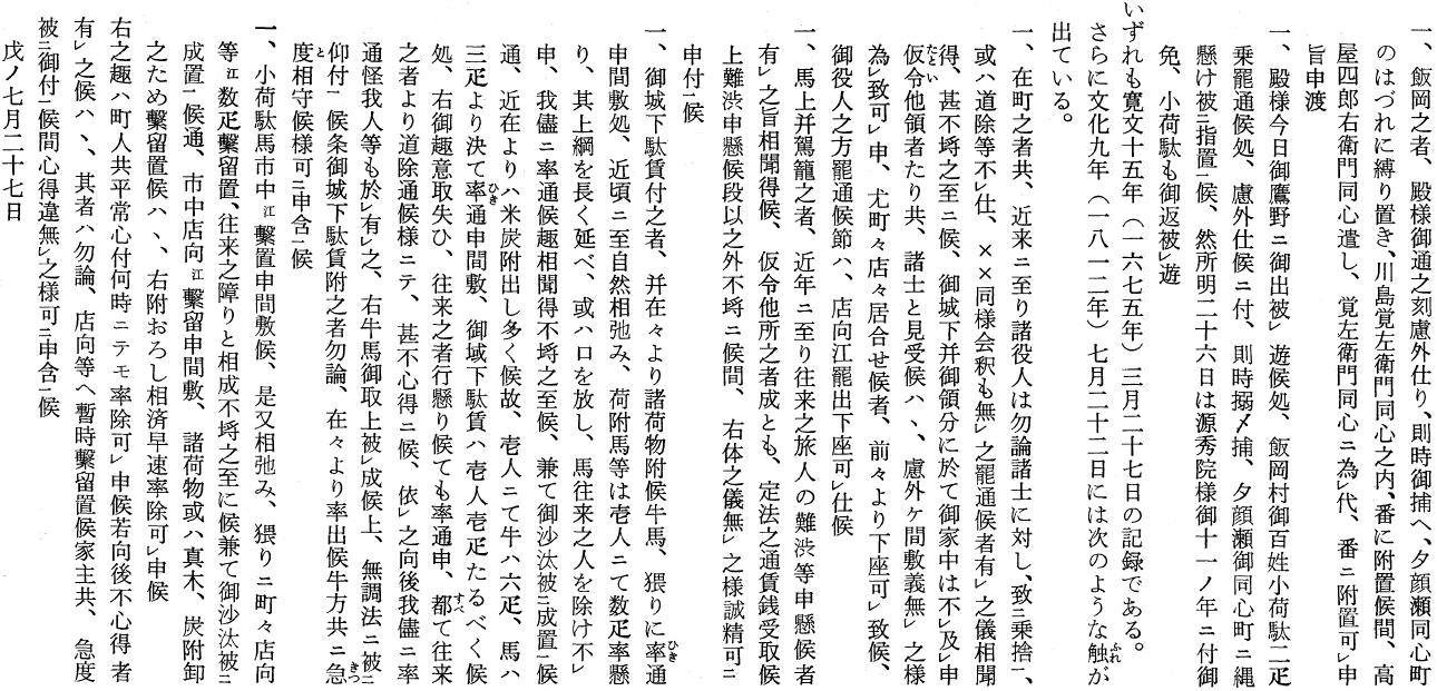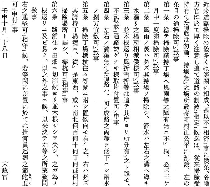 という布告をなしているが、当時これがどの程度までその目的を達しえたかはともかくとして、これらの布達は如何に明治新政府が民心の懐柔に意を注いたかを知るに足る資料であると共に、政府の抱いていた社会政策の一端の表現であるとも見ることが出来、これによって当時の世相の片鱗を窺うことが出来るのである。