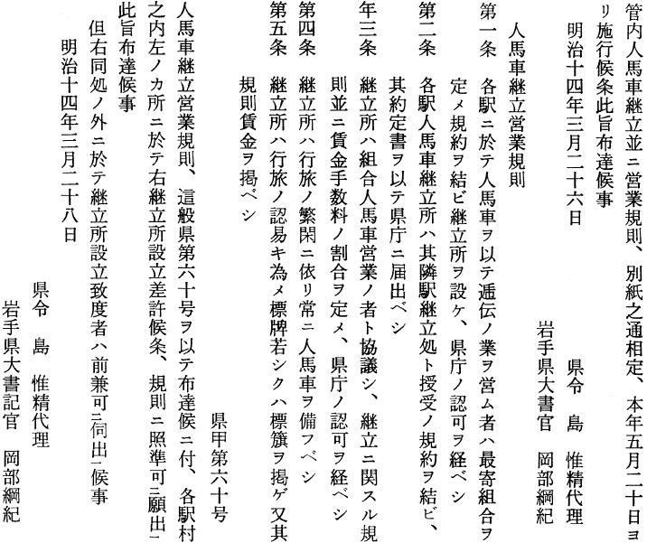 郵便以外の貨物の托送、人々の旅行は新たに組織された陸運会社によって運ばれることになったのはそのためである。かつて岩手県では、旧盛岡県時代の明治四年正月から、伝馬所の駅役人を改称して、元締役(もとじめやく)と称していたが、郵便の実施や陸運会社の組織に伴い、それが廃止されるに至った。明治五年十月二十二日大蔵省は「陸運社会ノ儀ハ相対継ノ稼業ニシテ物貨運輸ノ私会ナレハ、従前ノ伝馬所トハ全ク別種ノモノニ候云々」と説明している。郵便は官営となるに反して、陸運会社は民営となるので駅役人は不要になる。駅伝制度の変革であり、交通通信上の大転換の一つである。明治六年二月十三日、従来の駅役人たる元締役を廃止し、同年二月二十日に陸運会社が開設される。陸運会社は従来の駅伝制度の幾部を代行するものであるが、前者は公的機関であるのに対して、後者は後世の通運会社の性質を具備した私的法人であった。