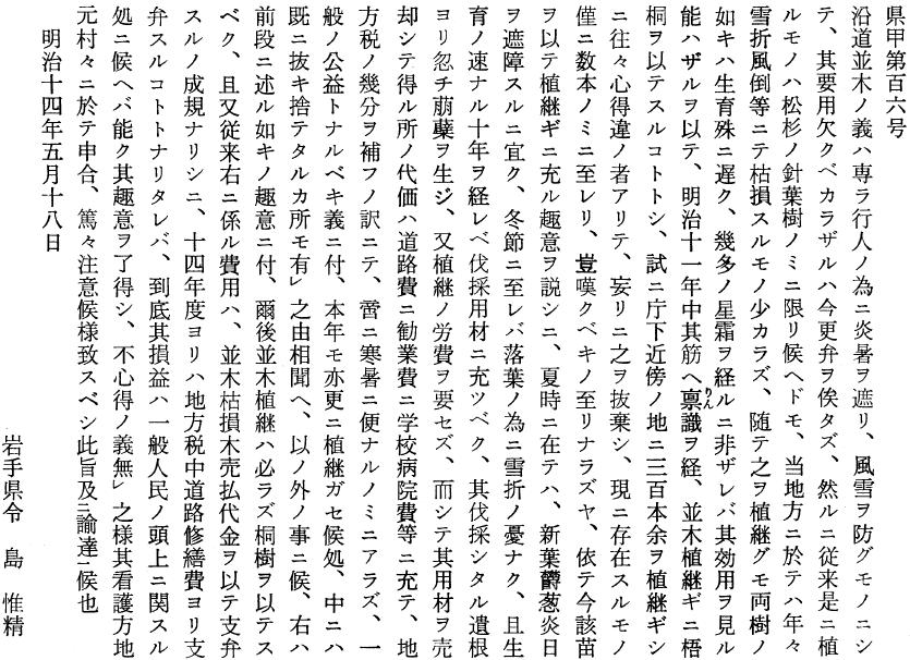享保九年六月にも重ねて秋田街道の並木植立が指示され、本宿弥兵衛新田の近傍が、大釜村の分担すべき区域であるとして、大釜村の植栽を怠っていると雫石方から非難している。