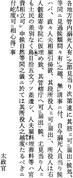 上記等のもの之あり候は、常々親類組合などは申に及ばず、重立たるものより夫々助け方厚く申し合せべきは勿論に候得共、実に取続き難く難渋に至り候はゝ、其の次第吟味をとげ申し出べく候、取調の上御救助筋へ伺い出遣すべき事