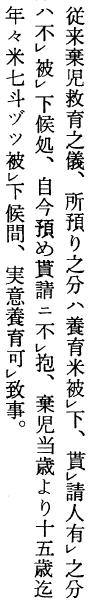 棄児養育米の儀、辛未八月中相達通り、十五歳まで年々米七斗宛下ヶ渡し来り候処、自今満十三歳を限り下され候条、生年月日見定めの儀は其所戸長等立会、身体骨格等篤と検査し本年第三十七号布告に照し、年齢相立候様致すべき事