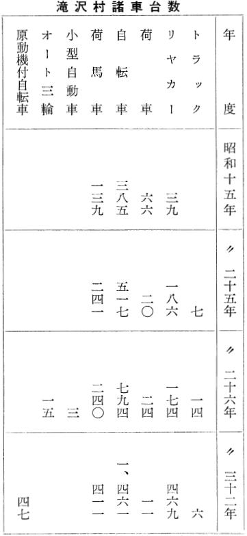 大正年代になると自動車がはいってくる。乗用自動車については大正三年二台、同十五年百十五台、昭和六年四百四台。トラックについては、大正五年二台、同十五年三十三台、昭和六年二百三十台となっている。自動自転車は大正四年の一台から同十五年には四十一台となる。諸車の合計数において大正元年を百とすると、同十五年には、四倍近くの三百九十五の記録を見る。従って大正時代は諸車の発展時代ともいえる。
