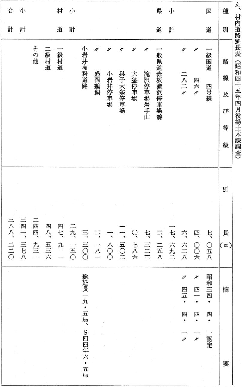 また県道においては昭和三十四年三月三十一日小岩井停車場線大釜停車場線・滝沢停車場岩手山線・赤坂滝沢停車場線が、本村内の小岩井・大釜・滝沢の三駅に通ずる道路として県道に認定された。