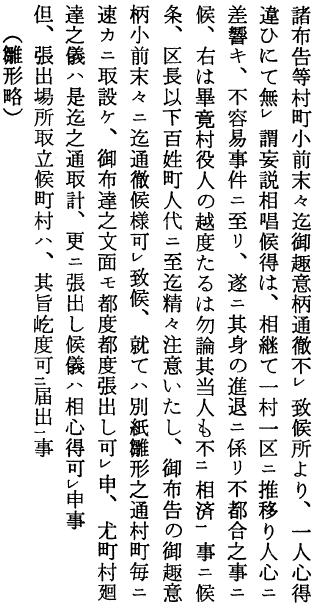 旧藩時代には、上からの布告は村役人が代官から伝えられ、さらにこれを一般民衆に告知する方法によった。しかるに明治六年(1873年)二月に左の布達によって、新たに高さ八尺位、横一間半上部にひさしをとりつけた掲示板のごとき布告板が出来上がった。しかもこの布達には