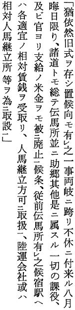 明治五年七月朔日には郵便法が実施され、ここに従来の駅伝制度が一大変革を来たすこととなった。諸官庁間の公文書はもちろん、その他の書信は郵便に托され、従前駅伝による各駅間の逓送物品は、新たに組織された陸運会社に移行する基となった。