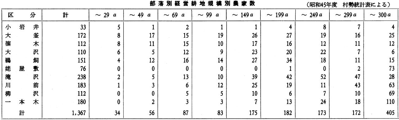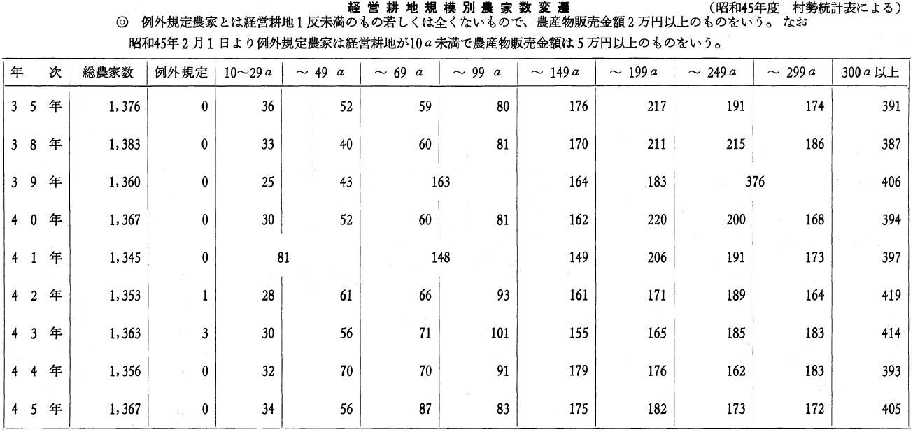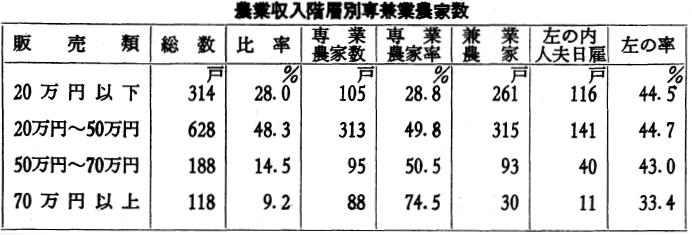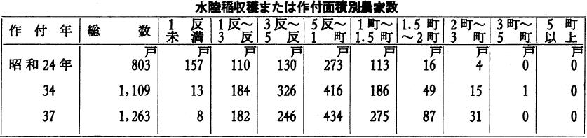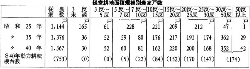 先ず農業経営の規模と、農地所有戸数の関係である。耕地が殖え、生産が増加したのであるが、五十町歩以上の大地主が二倍以上に増大しており、資本主義経済が農村に浸透していることがわかる。明治の初期、土地所有権が確立して、土地の売買が自由になったが、明治中期から大正にかけて、いかに変ったか。例えば明治二十七年五十町歩以上の大地主が三十三人あったのが、大正十年になると八十二人に増している。ところが一町歩以上三町歩程度の中堅農家は減少している。このことは明らかに大地主の増加に伴って、中層や下層の農家が大地主に農地を吸収兼併されていることを意味する。これは幾多の要因からくる結果ではあるが、資本主義下における自由経済の時代では、資本の蓄積のない三町歩以下の農民は、農業経営によって、全生活を支えようとするため、その収支に、ややもすれば平衡を失い、資本に余裕のないものから負債を生じ、農地を失うことが多分にあった。殊に小農小作農に至っては、なおさら、税金・肥料代・社交費・生活費に困難があった。