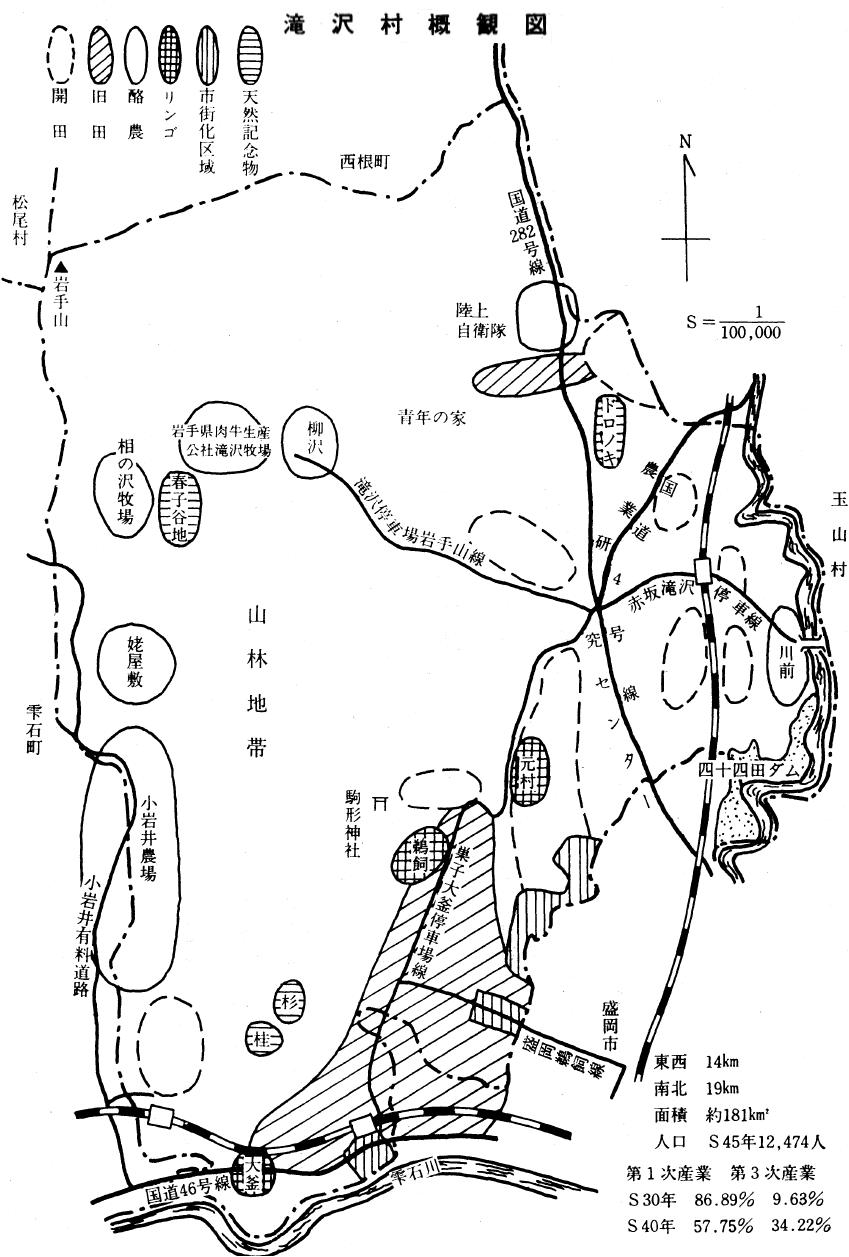 この事業は、火山灰地におおわれた岩手山麓一帯に、潅漑用水を導いて水田や畑を造成しようというもので、二十八年から本格的に着手され、その範囲は盛岡市、雫石町、岩手町、西根町、滝沢村、玉山村、松尾村と七市町村に及ぶ広大なスケール。そして四十二年七月でほぼ工事を終り、事業前の水田・畑面積五百五十八haが八千三百四十五haに増えた。