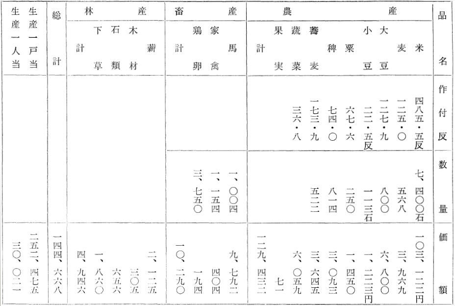 本県農業の生産額は県内産業である農林畜鉱水工の六種中、明治三十六年には六二%、同四十四年には五六%、大正七年に五〇%であったが、大正十五年には四六%となっている。しかし郡役所が明治十二年以来大正十五年廃止まで農産業指導の前線にあって、町村の農業生産指導の前線にあったことはどうしても見落すわけにはいかない。また町村の農業生産は、経営の近代化に伴って躍進をしている。しかし、その半面農村にも資本主義経済の潮が波及して、工産物その他の生産物が伸びたのに比し、農産物の価格が低下し、耕地は金持や、銀行・会社に兼併されて、耕作しない不在地主が発生し、耕作農民は細農化や小作農民になる傾向を示してきたことである。