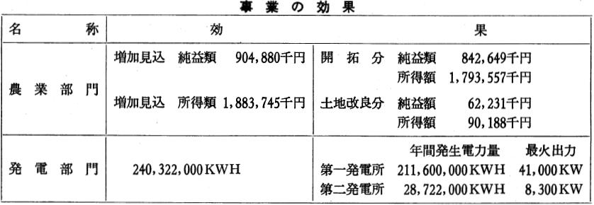 この結果、ダムの構造及び大きさを変更し、総事業費六十五億九千二百万円に抑えると共に受益につき検討を行ない、直接効果のみ妥当投資額六十六億一千百万円を得て、昭和三十年度より事業再開するに至った。