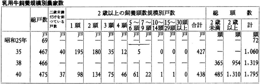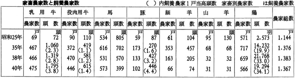 農地の拡大とその利用形態の変化と一体をなす本村家畜飼養の推移を次表 (家畜農家数と飼養農家数→) にみると、最も顕著な点は乳用牛の着実な増加と馬の減少である。昭和二十五年と同三十年を比較すると乳用牛はもちろん、役肉用牛、豚、めん羊、鶏共に顕著な増加を示している。しかし、同三十五年以降の増加の足どりをみると役肉牛は増加速度が緩慢であり、豚は昭和三十八年以降横ばい、めん羊は三十五年を、鶏は三十八年を頂点にして減少している。これに対して乳用牛は着実に増加し、馬と山羊は減少の一途をたどる。すなわち、本村畜産は古くからの馬産地帯としての馬と、戦後の食料自給に一役をなした山羊とが減少し、同三十五年以降は乳用牛、役肉牛、豚、鶏という動物性蛋白質供給を主体とする商品的畜産に転換したことによるからである。昭和二十五年から三十五年に至る十ヵ年に質的転換をとげた本村畜産は四十年に至る五ヵ年の間に乳用牛飼養、すなわち酪農化の方向を明確に示している。もちろん役肉牛、豚、鶏も一戸当りの飼養頭羽数の増加はみられるが本村畜産を代表するものに至るほどの動向を示してはいない。