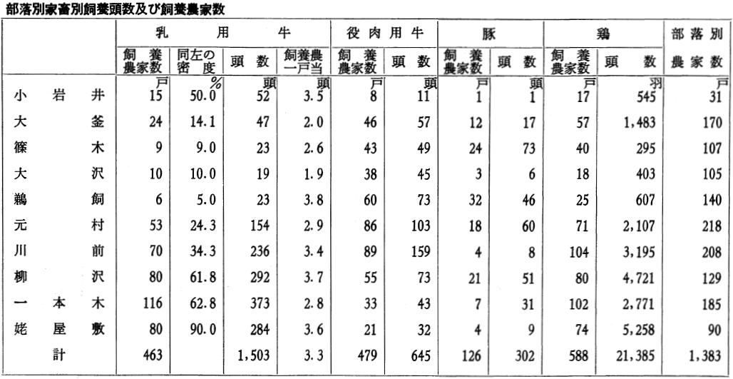 今日、本村畜産の主要方向とみられる酪農が本村北部及び西部の畑地帯であり、戦後開拓地域たる柳沢、一本木、姥屋敷、川前に集中することは土地利用形態の検討の際にふれた通りである。
