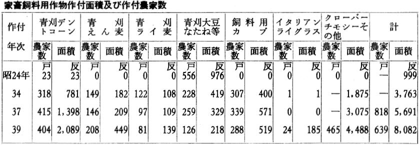 かくて本村家畜飼養は馬産から近代的畜産に質的転換をなし、開拓による入植、増反の畑作地帯を中心に酪農化が進展し、今日多頭飼養への方向を進みつつありと認められる。この様なあり方は家畜飼養基盤たる家畜飼料生産の面にもとらえられる。一言にしていうなら家畜飼料生産のための土地の集約的利用の進展である。次の表 (草地面積及び利用農家数→) の草地の家畜飼料生産利用をみると昭和二十五年は馬産が残り、今日的畜産の導入されなかった時期に対し、三十五年以降では採草放牧地及び山林のうち採草放牧するものの面積が減じて、永年牧草地利用が増加している。そして昭和三十五年以降酪農の進展が確立してからは永年牧草地利用すら減じている。これら採草放牧地や、永年牧草地等の草地利用の減少はその草地自体が利用されないで放置されていることを表の数字が示しているのではなくて、自然草地であった採草放牧地も、多少の人工が加えられて改良草地と移されるに至れば、永年牧草地として分類され、永年牧草地も管理よろしきを得て牧草生産力の高いものは、飼料畑として調査上分類されるごとく、かゝる減少傾向はむしろ土地の集約的飼料生産の進展の現れと理解すべきであろう。採草放牧に供した山林を開墾、牧草播種をなせば牧草畑となることまた同様である。これを裏付けるごとく飼料用作物作付面債は顕著に増加している。次の表 (家畜飼料用作物作付面積及び作付農家数→) はこれを示している。作付面積の増加のみならず、作付作物の種類も本村畜産の変化に対応している。家畜飼料作としては青刈大豆、なたね一辺倒の昭和三十五年に対し、三十五年以降減少の一途をたどり、それに代り青刈デントコーン、牧草類、育刈えん麦、飼料用かぶが作付され、特に前二者は三十八年、四十年と遂年増加を示している。サイロ、乾草材料として乳牛用自給飼料の中心であり、酪農化傾向に一致した現象が理解出来よう。