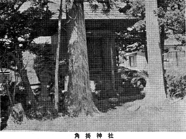 角掛神社の祭神は・伊弉諾・伊弉冉二尊の御子で山を掌る神すなわち大山祗(つそ)命と坂上田村麻呂の二神である。敷地は一反七畝十五歩あって元村にある。