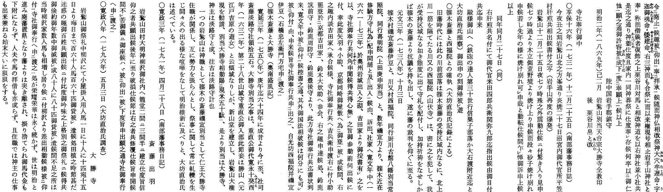 盛岡の大勝寺は、寛永十年(1633年)五月岩鷲山大権現の別当寺で、寺領百十一石余を有し、権勢の高い神仏両部の寺であったが、維新の大勢によって、神祇に転向することになったのである。同時にその末寺十二ヵ寺院も、悉く本寺にならって神祇奉仕に転向を願い出たのである。