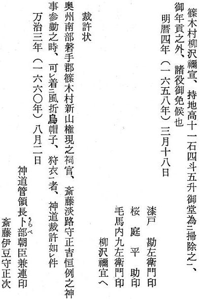 前は厨川通り大釜村八幡宮境内にて風折木剪取り頂戴仕り神楽殿建立仕り度き旨別当斎藤出雲願に依て下し置かれ候条根に御極印を入れ同人へ相渡し申し候紛敷儀これなき様剪り出させ申さるべく候以上
