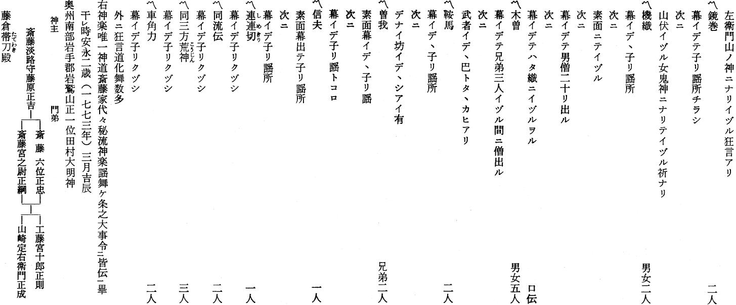 斎藤家所伝の神楽は、同家の安永二年(1773年)三日の伝授書によると、「右神楽は、唯一神道斎藤家代々の秘流神楽謡舞筒条の大事皆伝せしめおわんぬ」「岩鷲山正一位田村大明神神主斎藤淡路守藤原正吉」として、斎藤家から藤倉帯刀(たてわき)への神楽伝授書と知られ、このとき斎藤祠官と門弟が立合して神楽伝授が行われたものらしい。斎藤家代々の秘流という神楽については下掲の通りであるが天の岩戸開き、鳥舞、八幡舞、山神舞など諏訪まで十二番としてある。そのあとに蕨折から三方荒神、車角力などまでを追加伝授し「外に狂言、道化舞数多」としてあるから、三十曲以上伝授されたものであろう。
