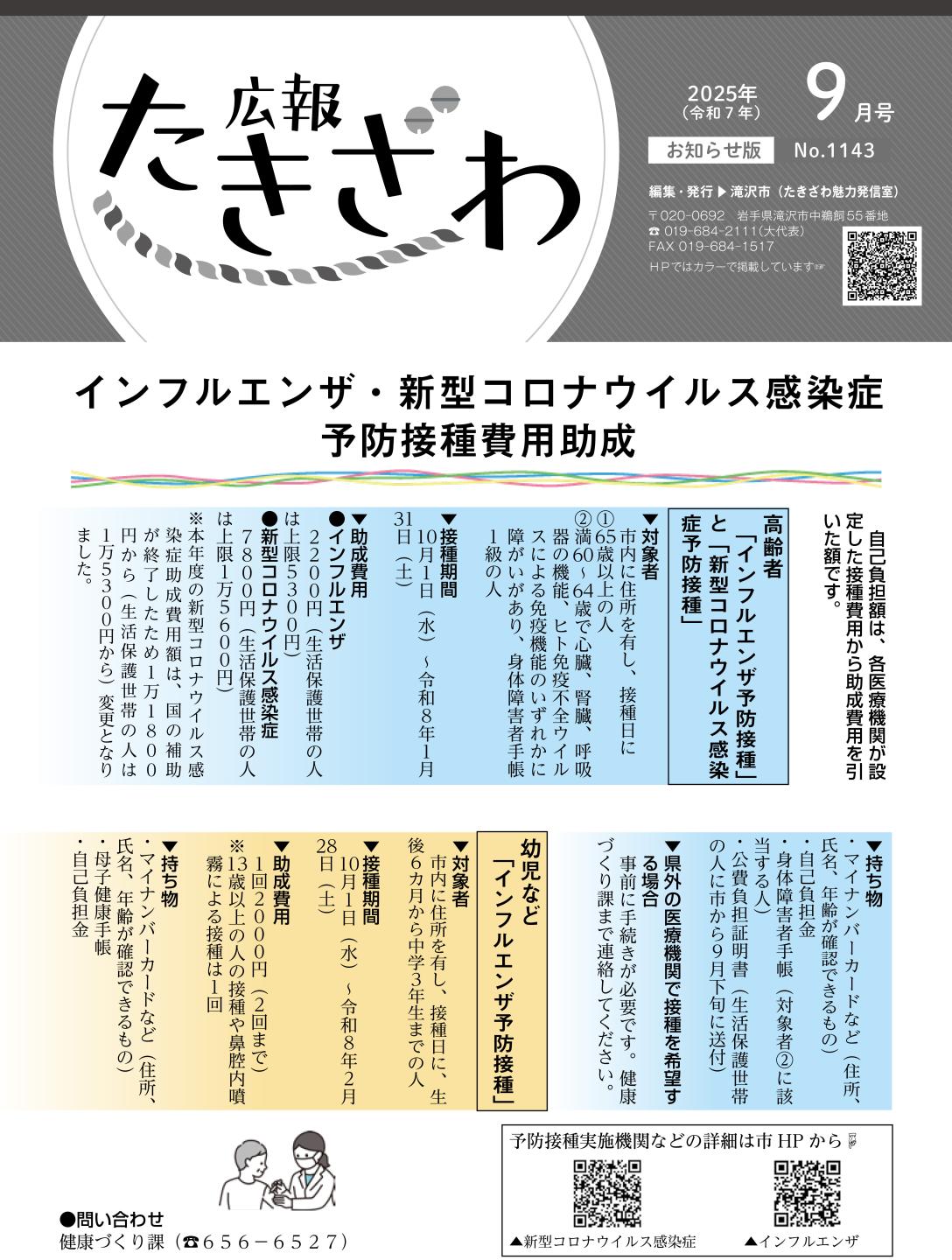 ホーム 滝沢市について 情報発信 広聴広報 広報たきざわ電子版 バックナンバー(令和7年発行分) 令和7年9月号お知らせ版(15日発行) 令和7年9月号お知らせ版(15日発行) ページID:04706 更新日: 2025年09月15日 令和7年9月号お知らせ版表紙 [244KB] 今月の内容は ウイルス予防接種費用助成 [202KB] くらしのダイヤル(2-4ページ) [593KB] カレンダー(高齢者) [236KB] カレンダー(子育て) [276KB] 令和7年9月号お知らせ版 全ページダウンロード [1247KB] 前のページに戻る トップページに戻る