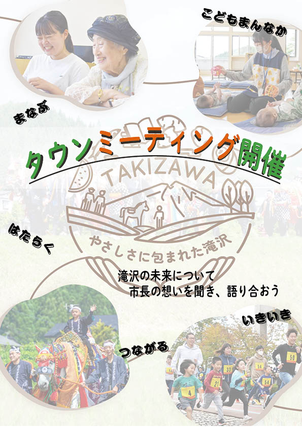 市では、滝沢市行政基本条例に基づき、これまでも「市政懇談会」や「市長と話そう」など市民との対話を促進する機会を設けてきましたが、この度、申し込み不要、出入り自由として、より気軽に参加いただけるタウンミーティングを開催します。