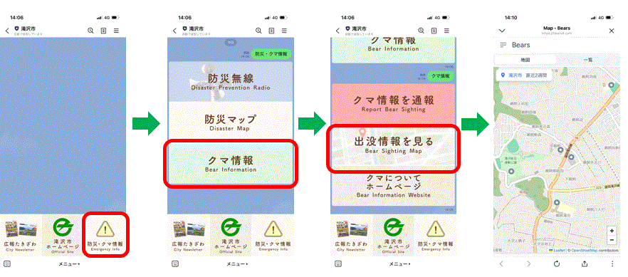 - 市公式LINEのメニュー内にある「防災・クマ情報」を選択