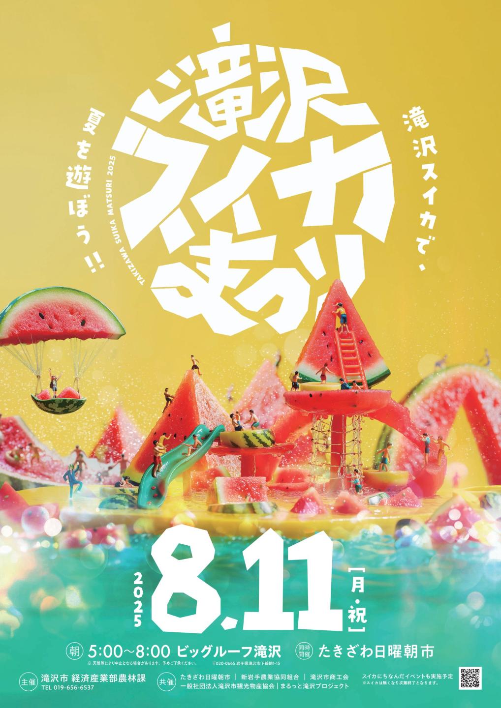 ホーム 事業者向け情報 農林業 イベント情報 (滝沢スイカまつり たきざわ朝市) イベント情報 (滝沢スイカまつり たきざわ朝市) ページID:00872 更新日: 2025年08月08日 「滝沢スイカまつり2025」について 滝沢恒例の、「スイカの夏」がやって来ました。 今年も滝沢スイカまつり・たきざわ日曜朝市を開催します! 生産者が丹精込めて作ったおいしいスイカがたくさん販売されるほか、毎年恒例「市長とのじゃんけん大会」やお子様向けのイベントもご用意しております。 夏の思い出づくりにぜひご来場ください! 日時:令和7年8月11日(月・祝)午前5時~午前8時 場所:ビッグルーフ滝沢 ※天候等により中止となる場合がございます。予めご了承ください。 前のページに戻る トップページに戻る