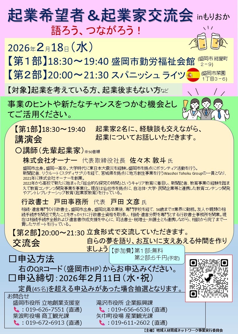 滝沢市・盛岡市・紫波町・矢巾町共催で、起業を目指す人や起業して間もない方のコミュニティ形成支援を目的として、先輩起業家の講演並びに起業希望者・起業家・起業・創業支援機関、金融機関関係者の交流会を令和8年2月に開催いたします。