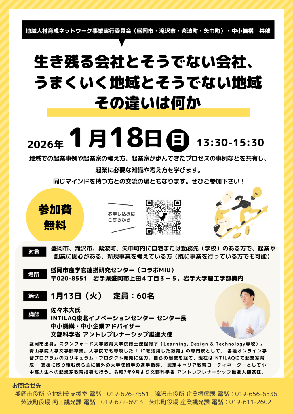 滝沢市・盛岡市・紫波町・矢巾町・中小機構共催で、起業・創業について学ぶ「生き残る会社とそうでない会社、うまくいく地域とそうでない地域の違いは何か」(セミナー)を開催いたします。