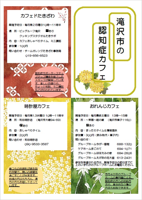 現在市内には3つの認知症カフェがあります。どなたでもお好きなカフェに参加できます。
