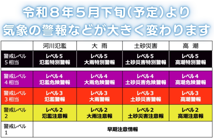 気象庁は、令和6年6月に取りまとめられた「防災気象情報に関する検討会」の提言を踏まえ、令和8年5月下旬(予定)からの新たな防災気象情報の運用開始を発表しました。