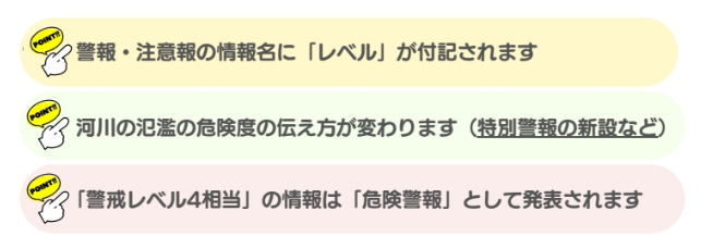河川氾濫、大雨、土砂災害、高潮に関する情報等は、これまで警戒レベルとの対応が複雑でわかりにくくなっていましたが、今回の改善により、避難情報の5段階の警戒レベルに対応し、避難の判断をしやすくなります。