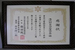 滝沢村表彰規程により、村の公共の福祉増進および地域活動に尽力されたその功績を称え、村長より感謝状が授与されました。
