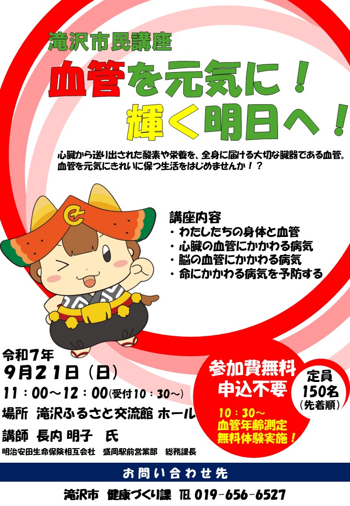 ホーム くらしの情報 健康 健康づくり 滝沢市民講座について 滝沢市民講座について ページID:02436 更新日: 2025年10月01日 令和7年度の滝沢市民講座は終了しました。 滝沢市民講座チラシのダウンロードはこちらから(PDF) [175KB] 日時 令和7年9月21日(日) 11:00~12:00(受付10:30~) 会場 滝沢ふるさと交流館 ホール 対象 滝沢市民 市内事業所又は学校に通勤・通学している人 内容 血管を元気に!輝く明日へ! その他 申込みは不要になります。 前のページに戻る トップページに戻る