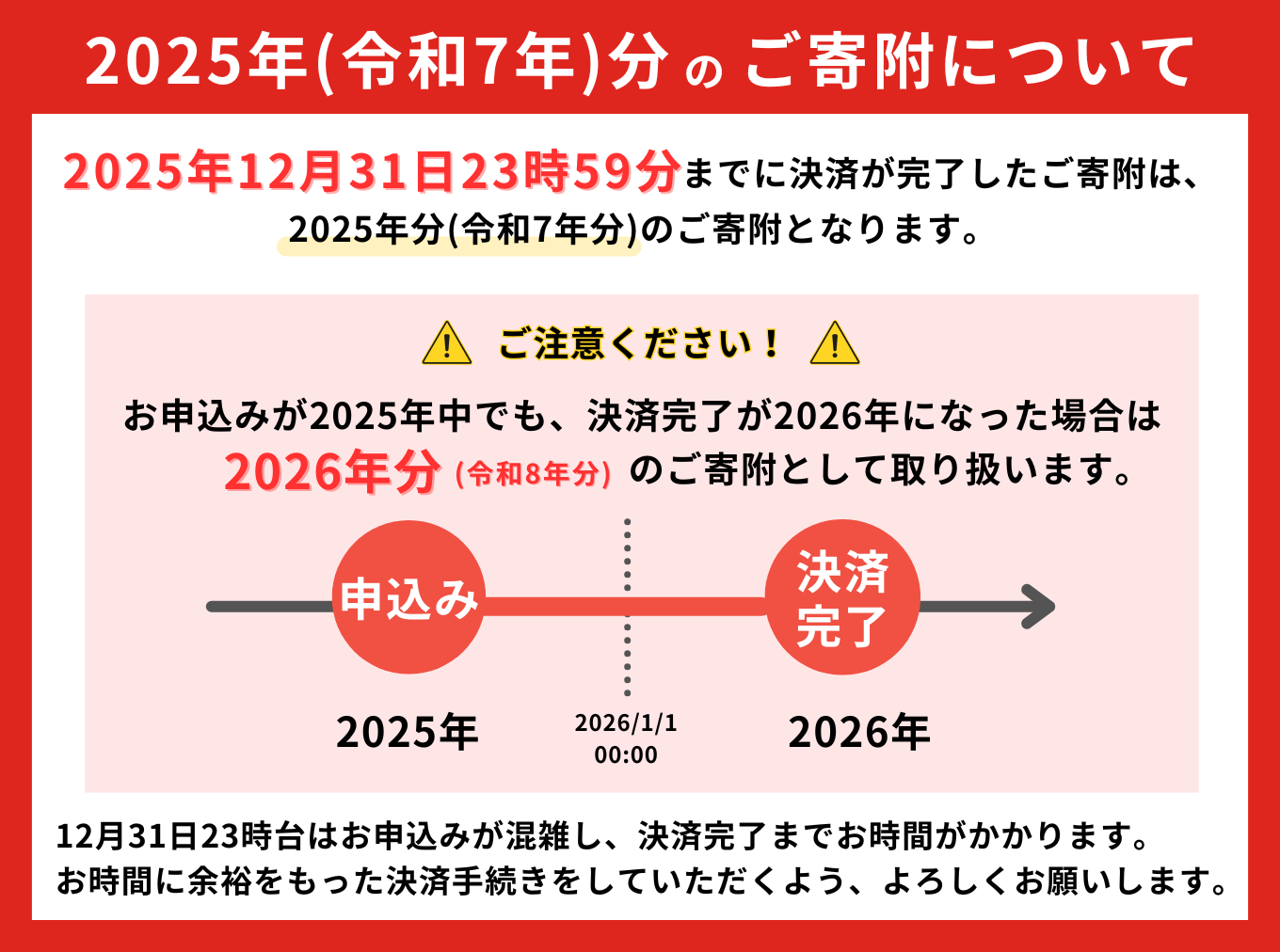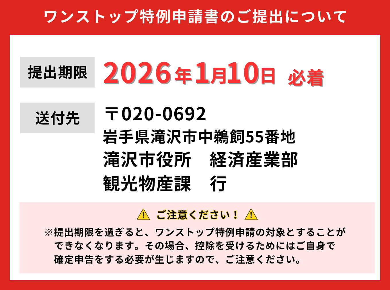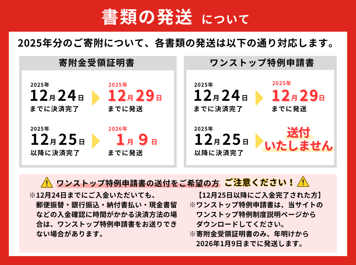 ただし、12月下旬以降につきましては、郵送の関係上、締め切りに間に合わない可能性がございますので、ワンストップ特例申請書を送付しておりません。
