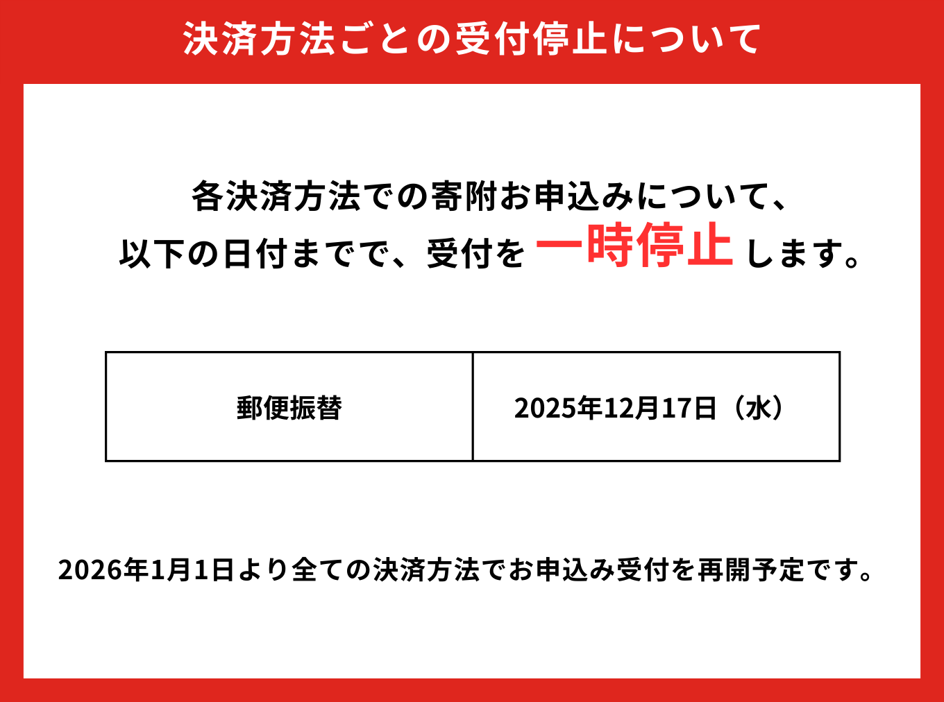 - 払込方法あるいはお住まいの地域によって、振込み手数料等が発生する場合がありますが、ご理解願います。