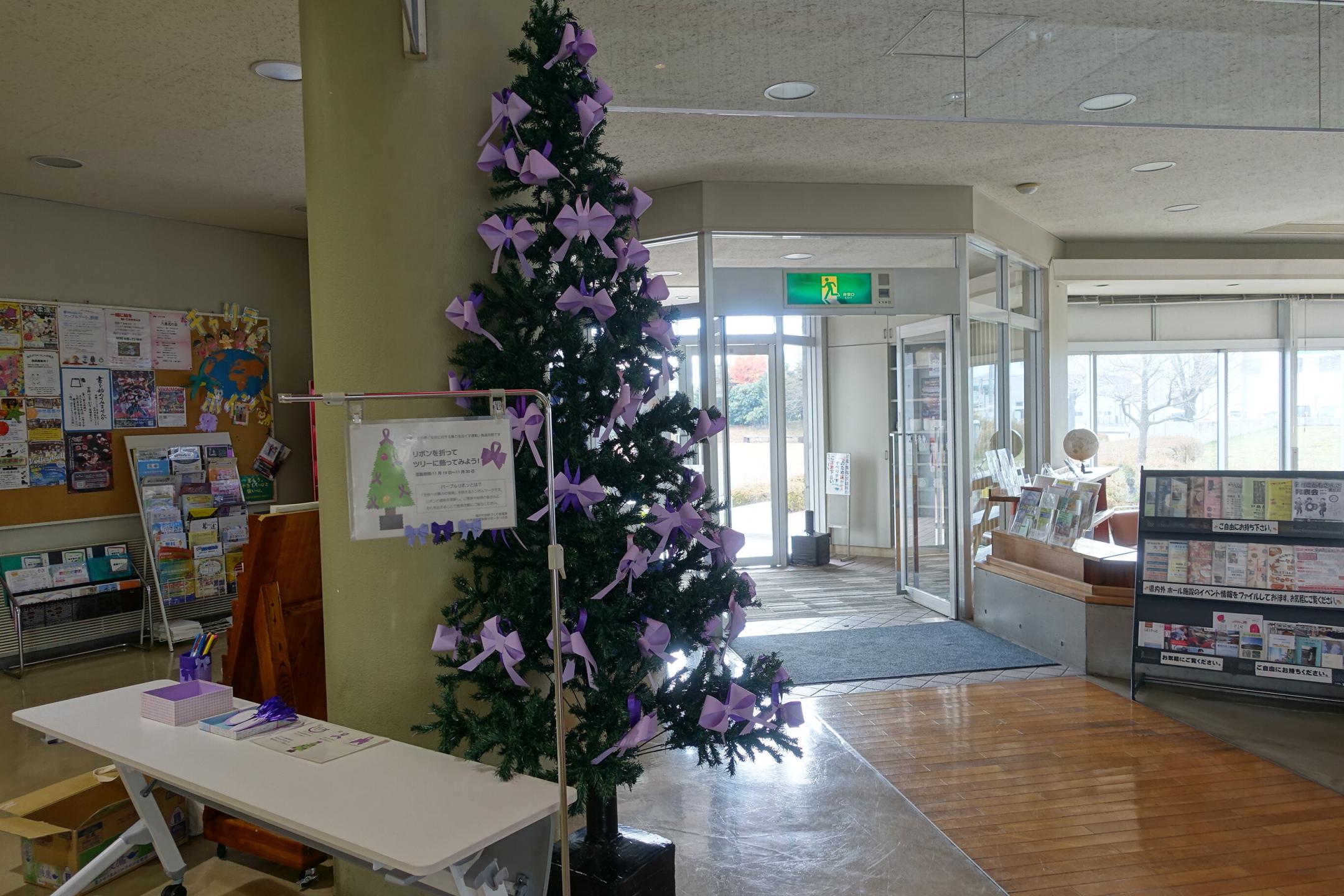 パープルリボンは「女性への暴力の根絶」を訴えるシンボルマークとなっており、リボンの意味を理解し、ツリーにリボンをかけてもらい、それを家族や地域の方と共有してもらうことで理解の輪を広げるのが目的です。