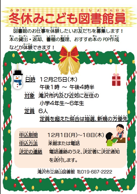 12月1日(月)~12月18(木)までに、図書館窓口か電話で申し込みください。