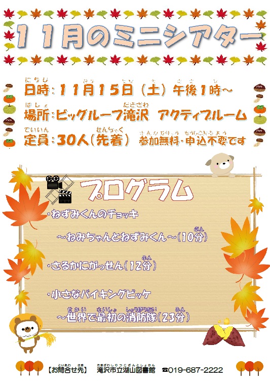 | 11月15日(土) | ビッグルーフ滝沢 アクティブルーム | 13:00~ | ねずみくんのチョッキ ほか |