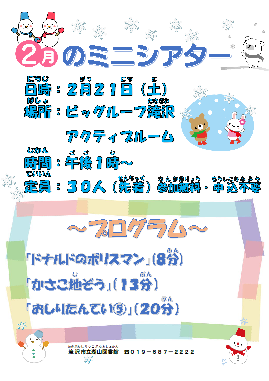 | 2月21日(土) | ビッグルーフ滝沢 アクティブルーム | 13:00~ | ドナルドダック ほか |
