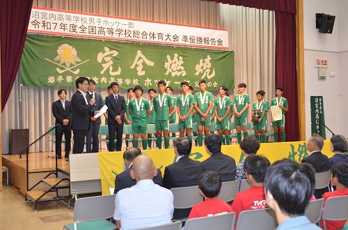 令和7年度全国高等学校総合体育大会ホッケー競技で準優勝に輝いた沼宮内高等学校男子ホッケー部の報告会が8月9日、岩手町の岩手広域交流センター「プラザあい」で開催され、来場者約130人が選手たちを称えました。